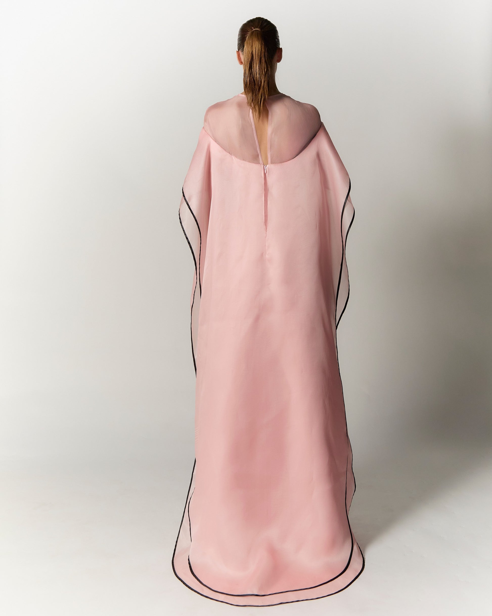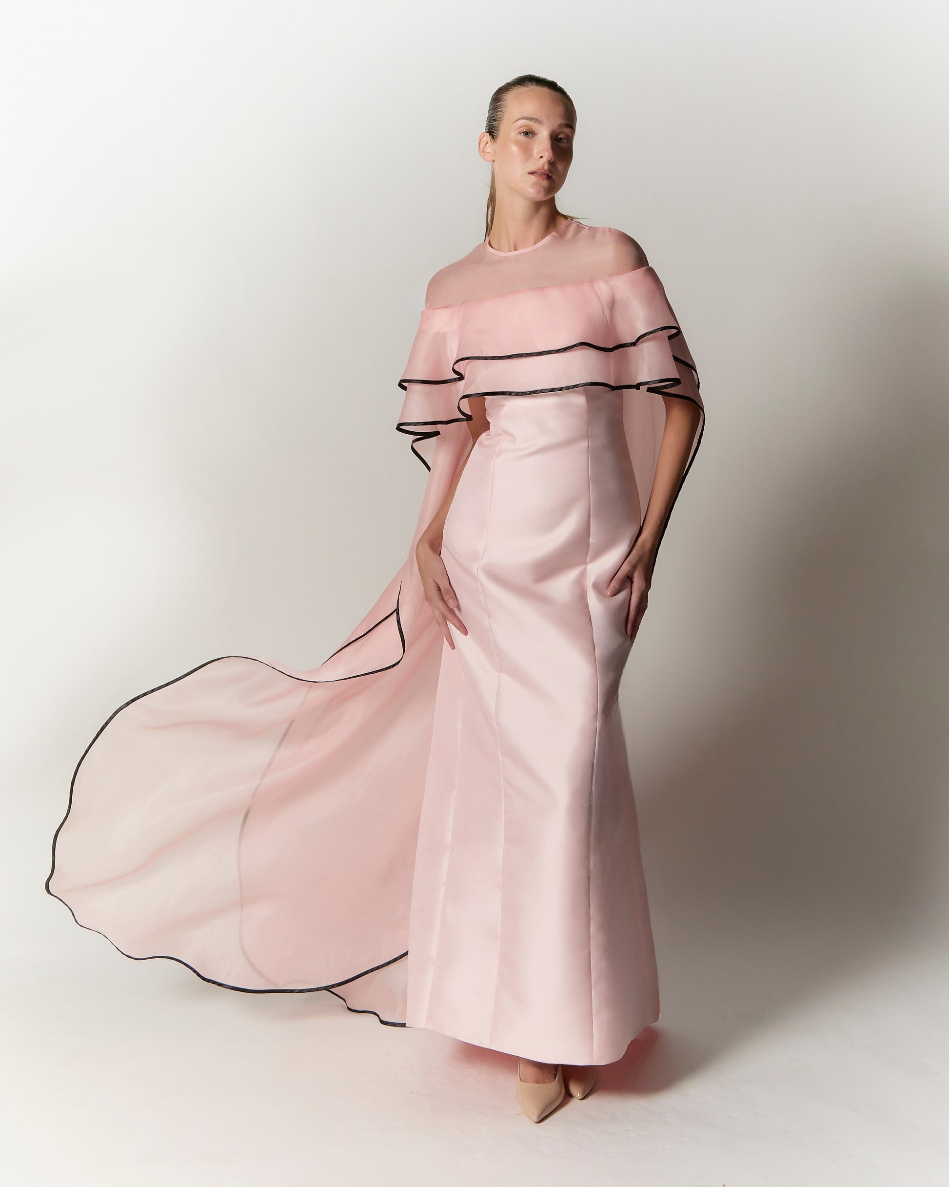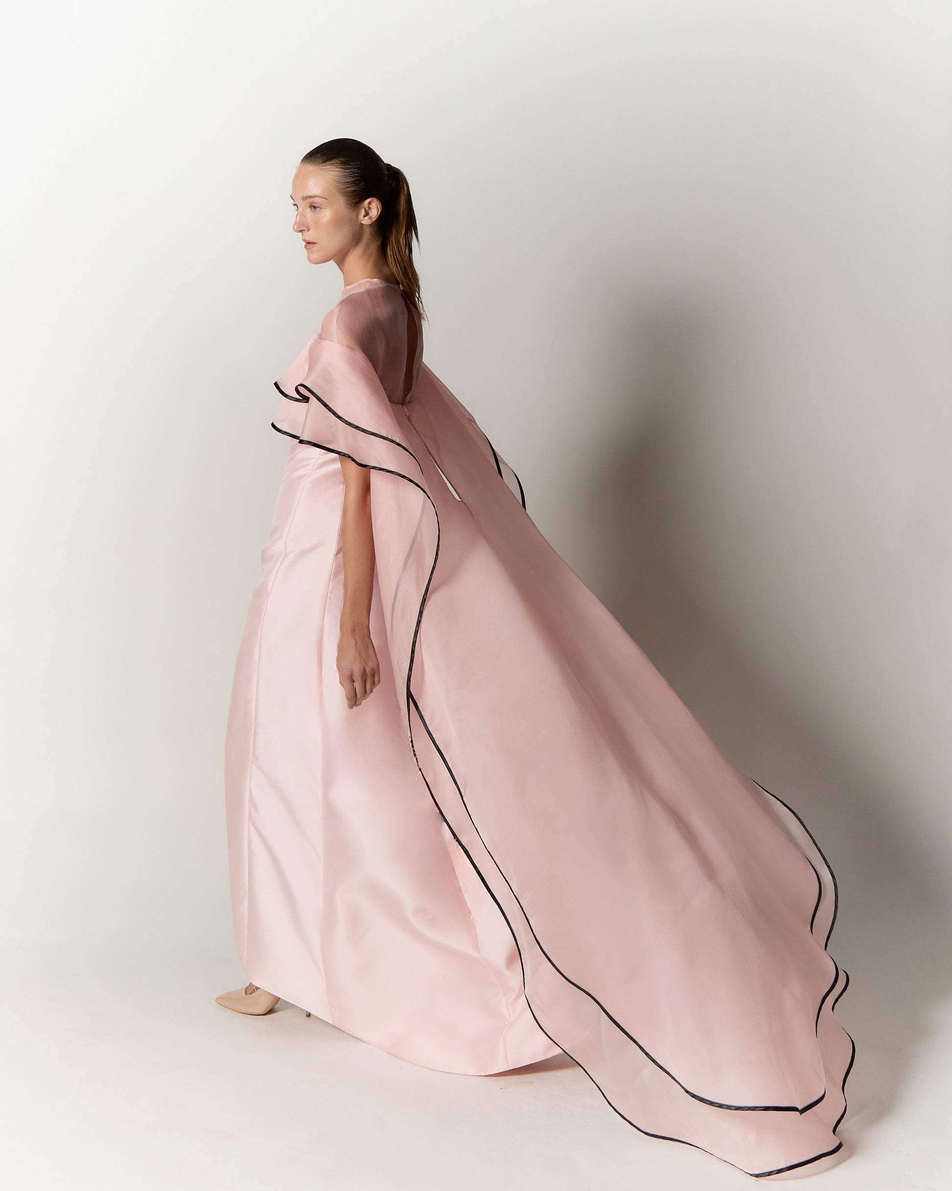 The Bretagne Gown features flowing silk organza layers over a sleek silk mikado base. Its lightweight, luxurious fabrics create an elegant look perfect for formal occasions.