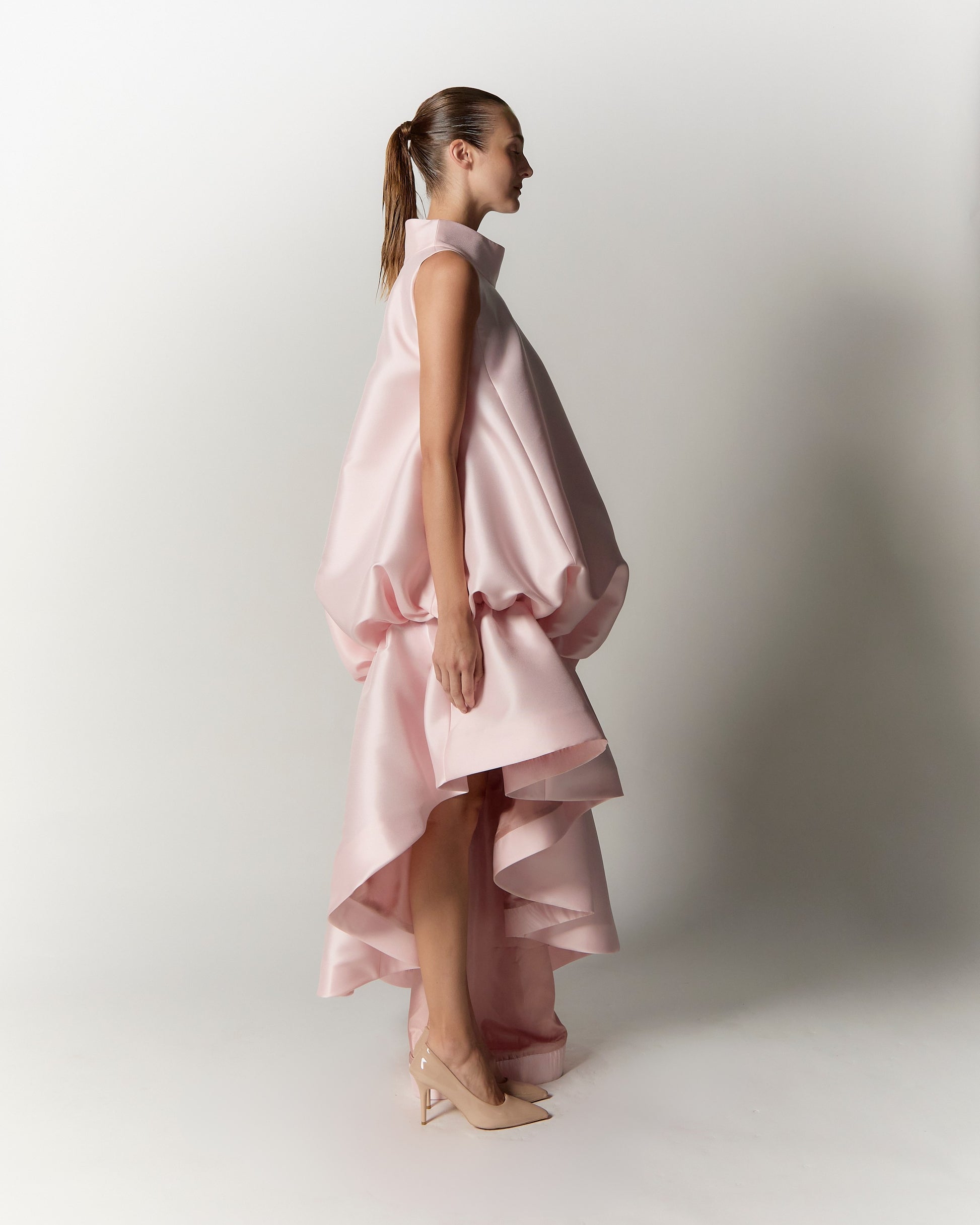 La Perlière is an asymmetrical bubble dress with a structured collar, offering a modern and elegant look for any occasion.