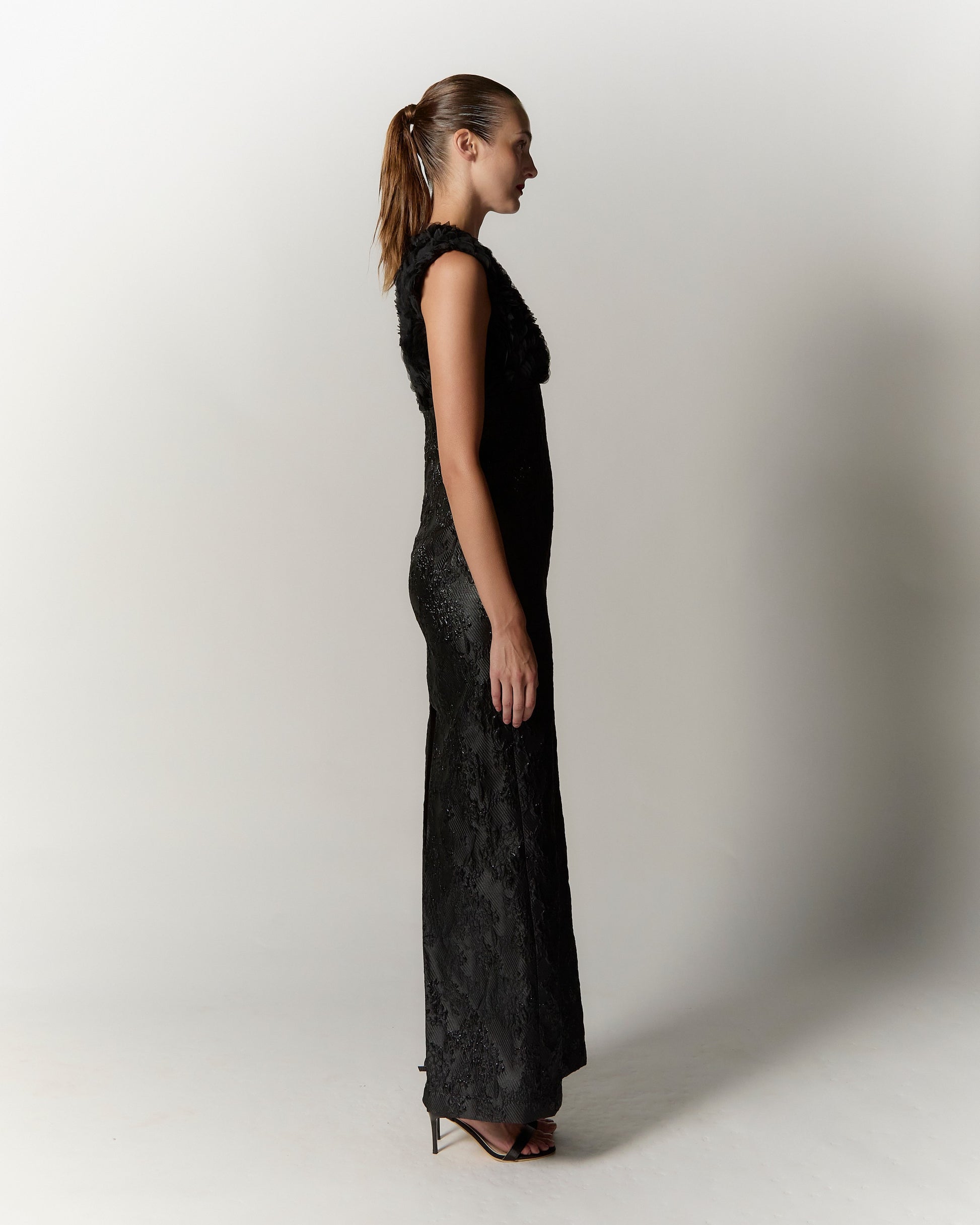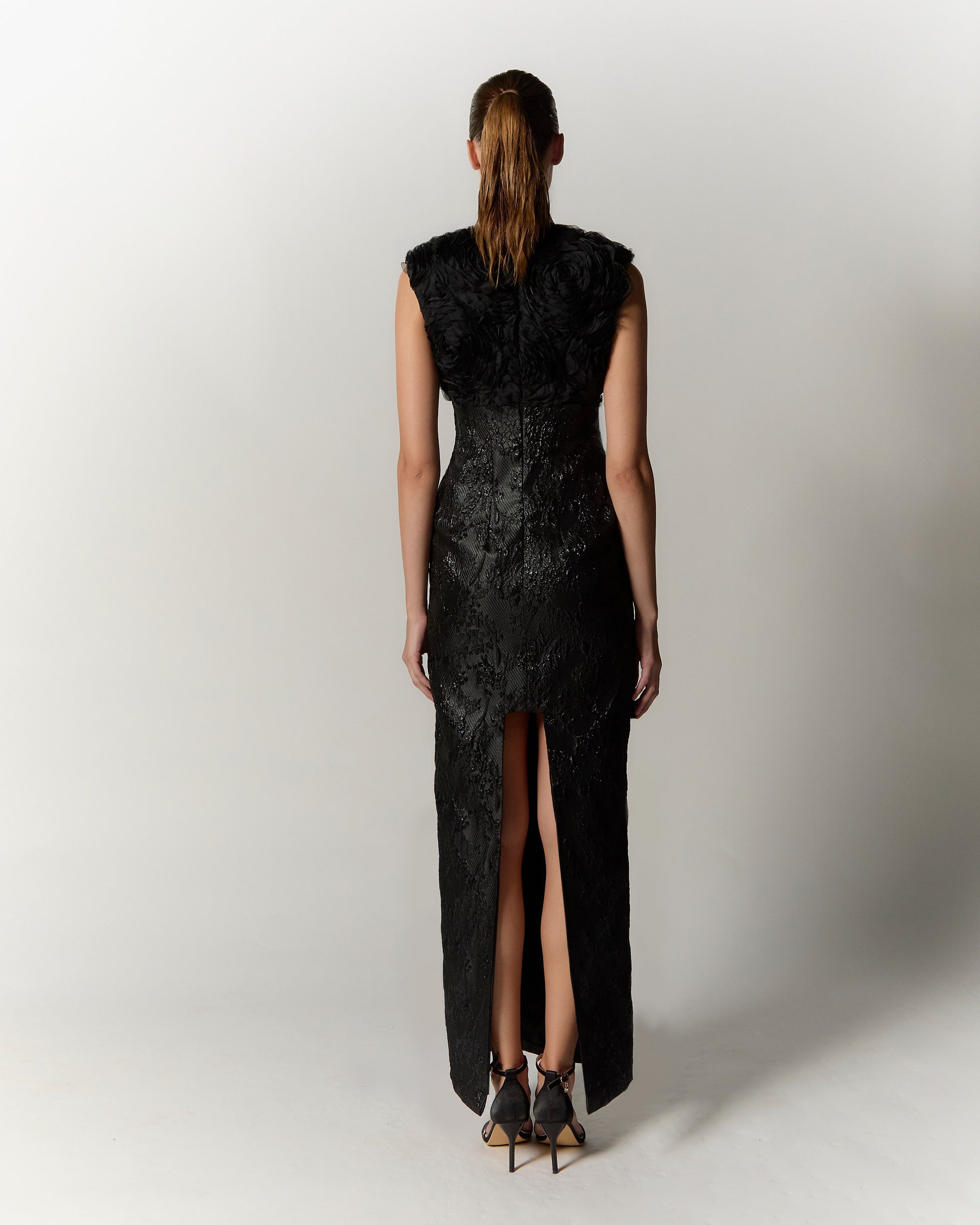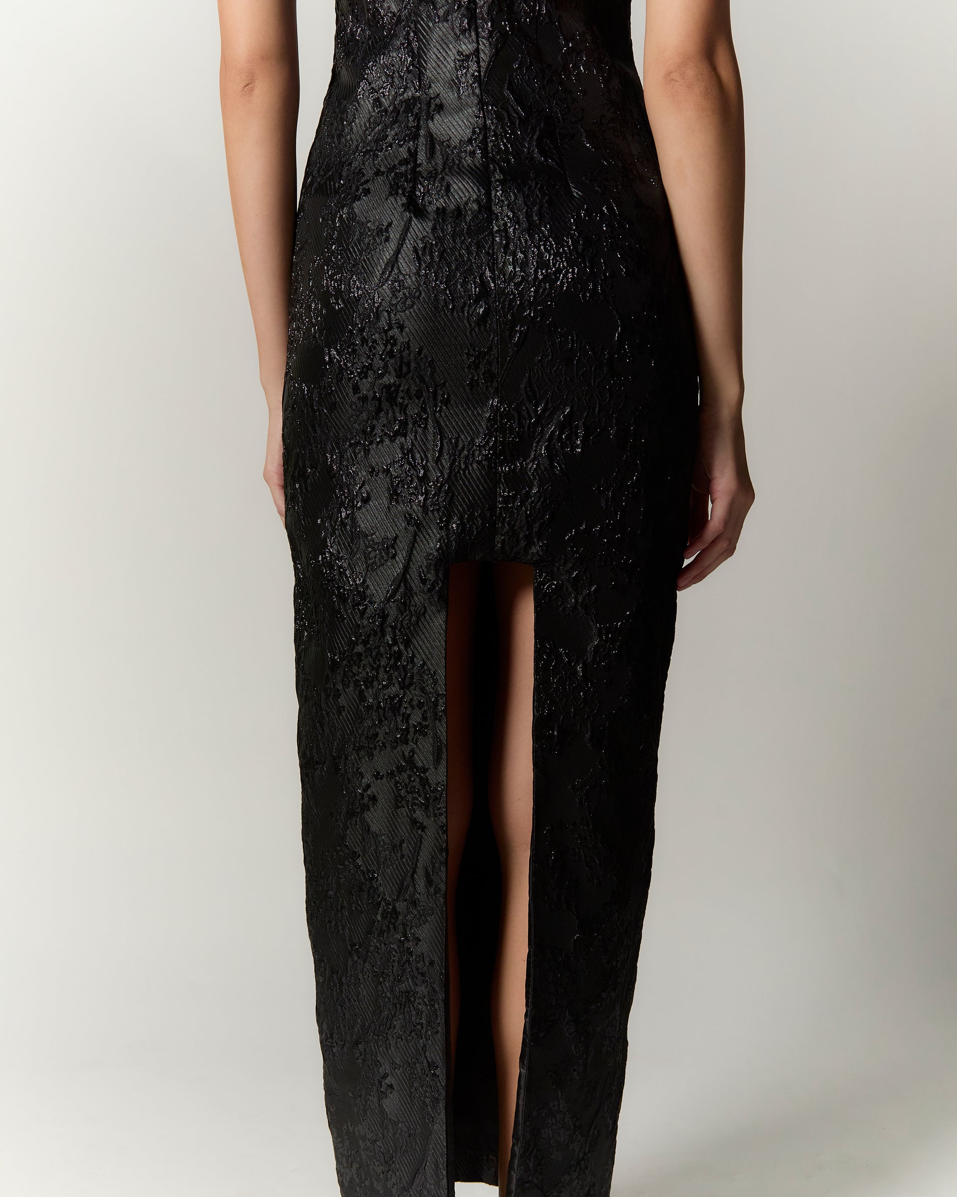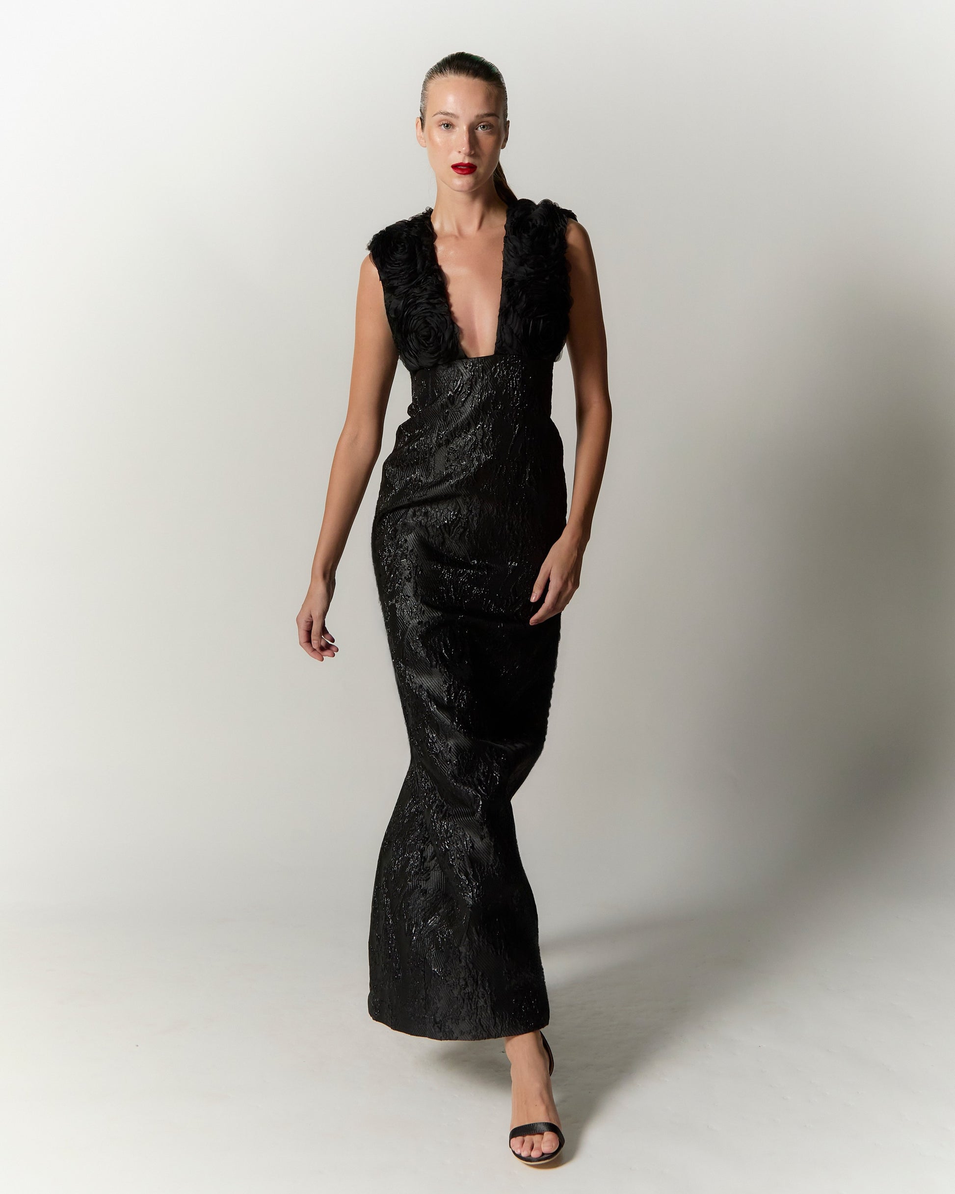 The Norman Dress features silk jacquard and 3D rose gazar for a textured, elegant finish. Its low-cut design offers a sleek, sophisticated look perfect for formal events.e piece.