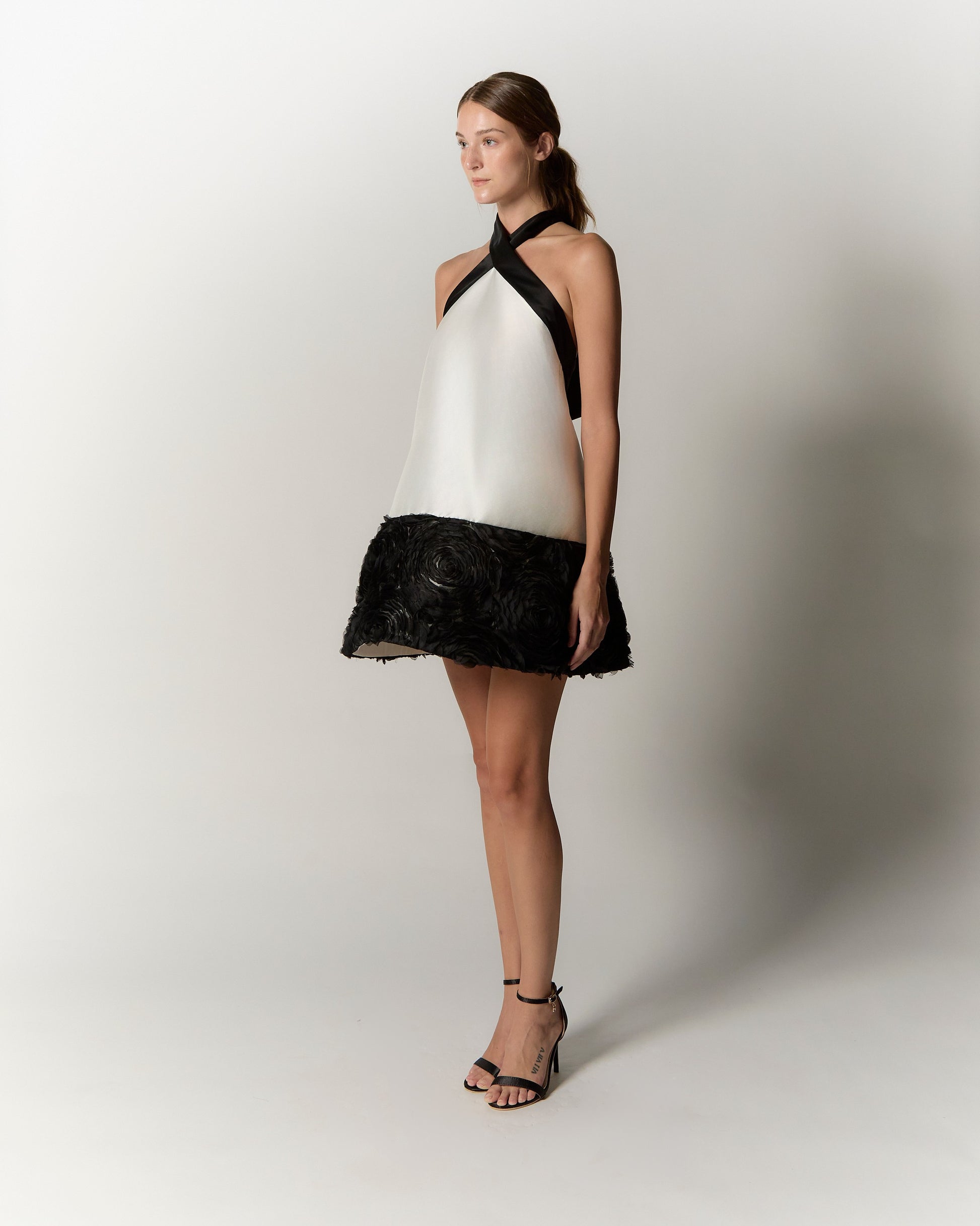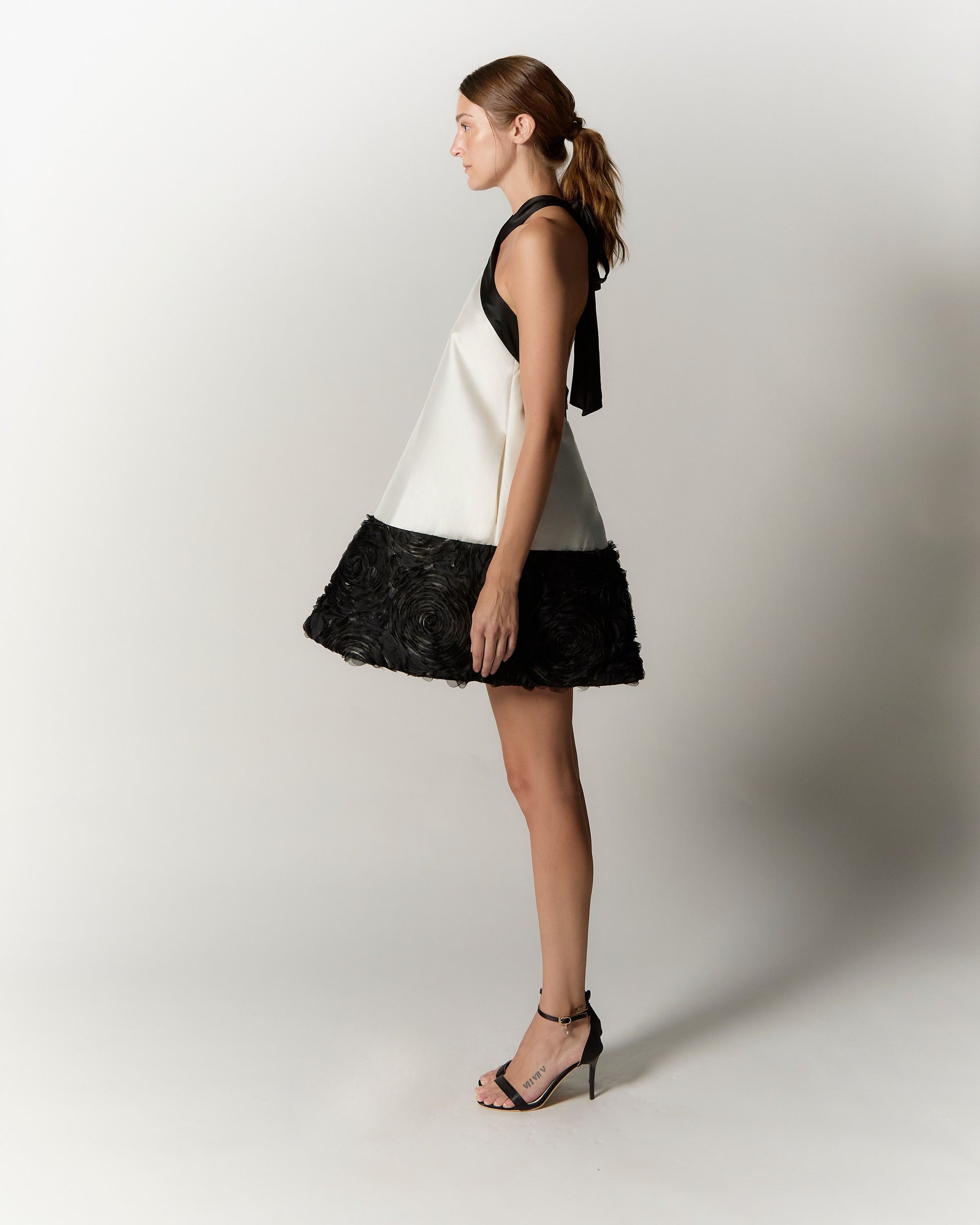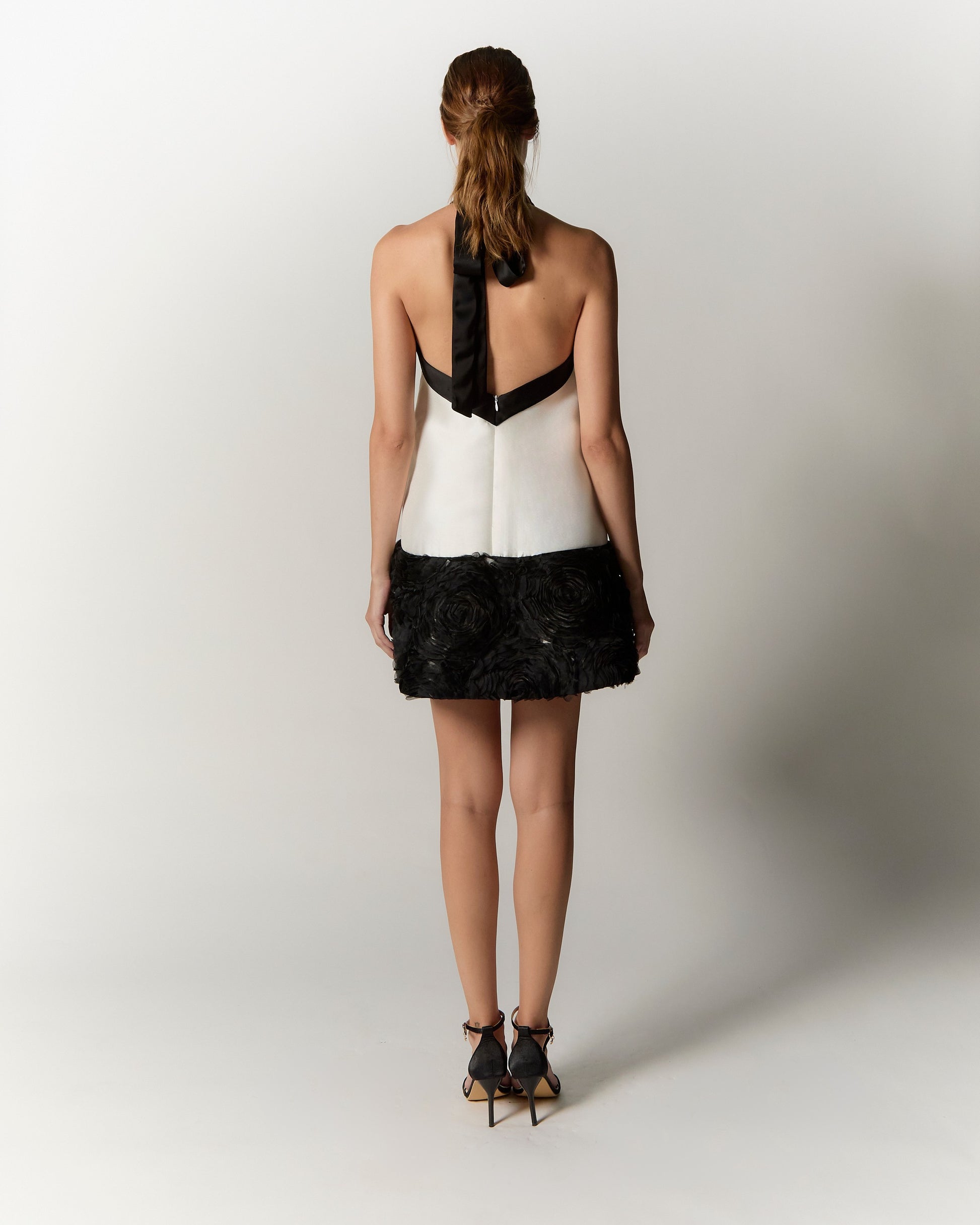 The Sarlat-La cocktail dress features white mikado fabric, a black satin halter tie, and elegant 3D rose gazar details. Side pockets add practical style.